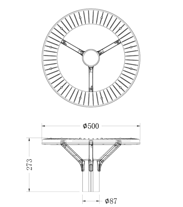 أبعاد المصباح 273مم×500مم×500مم، لديه طاقة 30وات-60وات، وله تصميم هيكل مدمج، مما يجعله مناسب للتركيب في الأماكن ذات المساحة المحدودة، مثل الدرابزين المنخفض، الجدران المنخفضة أو الأحزمة الخضراء الضيقة.